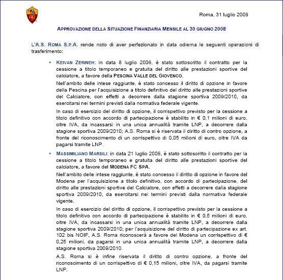 2008年7月21日,罗马俱乐部和摩德纳俱乐部达成协议,2008-09赛季马尔西利(Massimiliano Marsili,1987年7月14日出生,中场)被免费租借至摩德纳;同时摩德纳还获得了共有马尔西利的权力。如果摩德纳俱乐部得以行使此权利,则马尔西利的转会费为50万欧元,摩德纳俱乐部在2009-10赛季1次付清这笔费用;同时摩德纳俱乐部和罗马俱乐部签订共有协议,摩德纳将马尔西利的一半所有权以25万欧元的价格转让给罗马,这笔费用在2009-10赛季1次付清。罗马行使反优先仅的代价为15万欧元,1次付清。