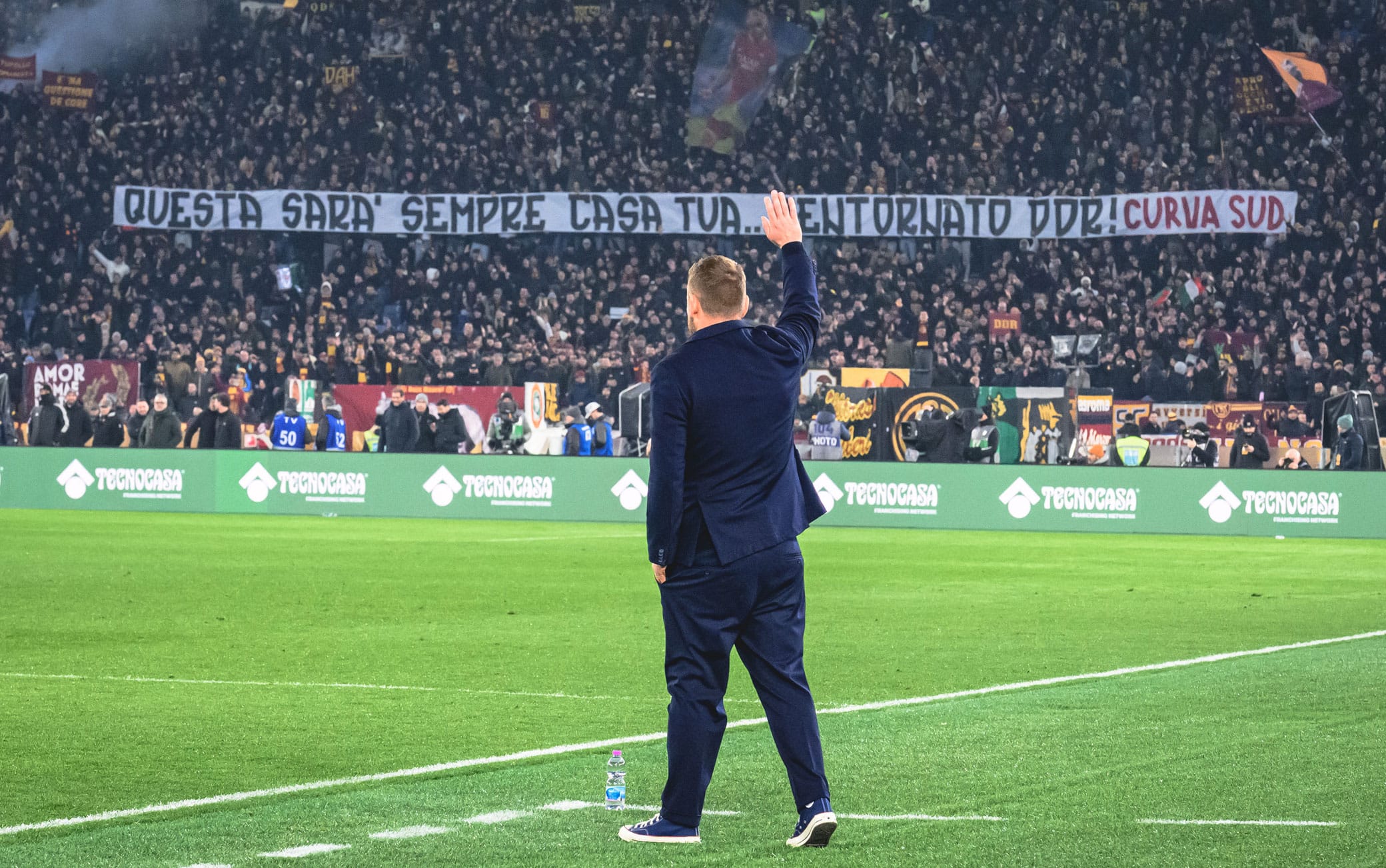 Ma il vero abbraccio è arrivato dagli spalti. Subito dopo, infatti, lo stadio ha voluto omaggiare il suo ex Capitano con una serie di striscioni carichi d'affetto. Dalla Curva Sud è arrivato il messaggio più diretto: "Questa sarà sempre casa tua, bentornato DDR". Mentre dalla Tevere Parterre si è levato un altro striscione che ne celebra l'essenza: "Del romanismo rimarrai sempre il vanto. Bentornato a casa Daniè". Ma i messaggi non si sono fermati qui, con altri settori che hanno voluto ribadire il concetto: "Sempre e per sempre la nostra bandiera" e "Avversari sì, nemici mai. DDR figlio di Roma".